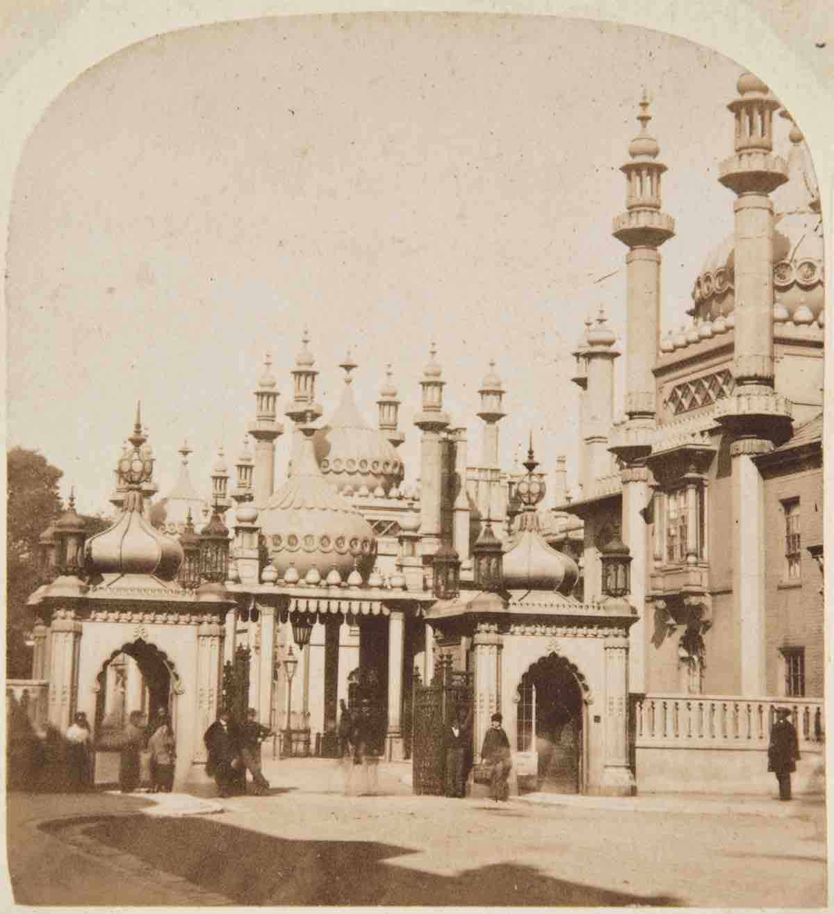 James Gray: [Middle left] These buildings were erected in 1852, soon after the Brighton Town Commissioners had acquired the Pavilion. The gateway remained until 1921 when it was replaced by the present Indian Memorial Gateway, the gift of the Princes and people of India. jgc_10_157