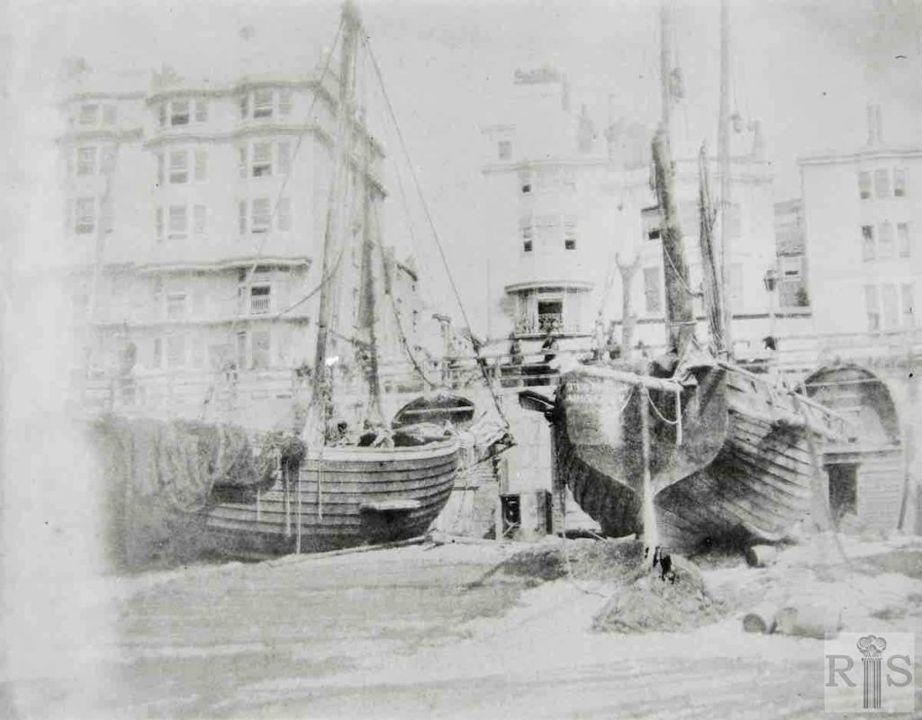 James Gray: Slightly further to the east these two photographs [see also jgc_03_157 on the Brighton Central Seafront: images on the beach (2) page] were taken on the beach opposite Black Lion Street and Market Street. This view is opposite Market Street. They show the fishing boats of the period. jgc_03_156