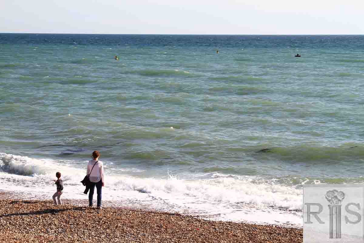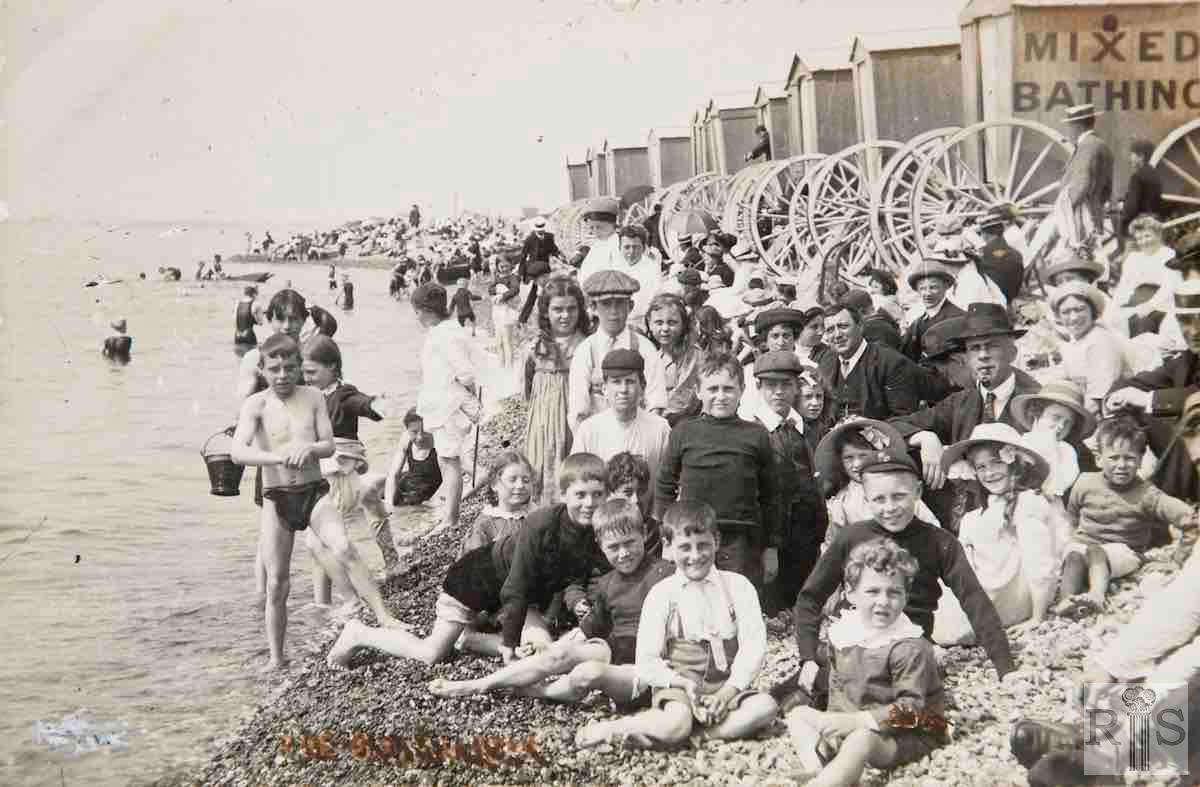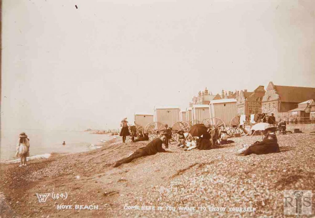 2018: It is impossible to determine the exact location of this cheerful 1919 image – or to replicate it today. The beaches, even closer to Brighton, are never now as busy and few would be seen wearing thick pullovers, suits, school caps or trilby hats! The bathing machines with their now superfluous message ‘mixed bathing’ are long gone, replaced first by bathing tents and then, in the 1930s, by the now brightly painted and enormously popular beach huts.