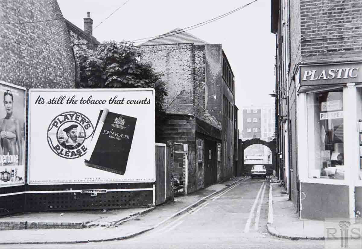 James Gray: This photograph of Jew Street on 10 June 1979 was taken for the sole purpose of showing all that was left of the old archway which led to the small infantry barracks. These had a short life, soon being replaced by the much larger barracks between Church Street and North Road. Additional information: Advertisement hoarding of Players cigarettes. jgc_25_034