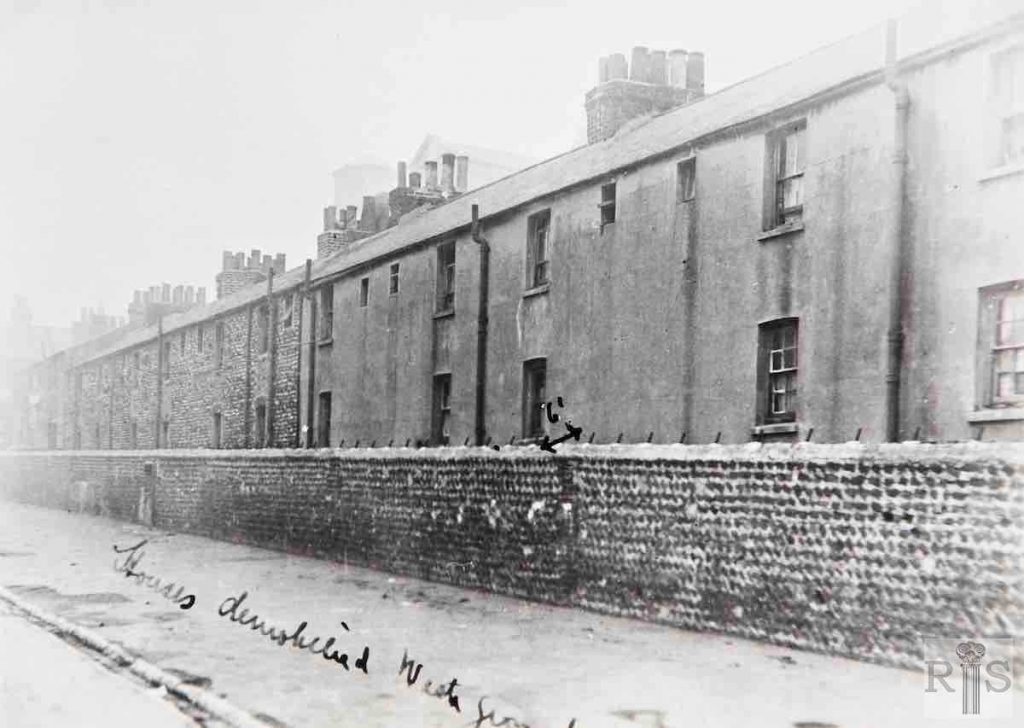 James Gray: The photograph shows the demolition of houses on the south side of Hereford Street, with the empty houses in Essex Place awaiting removal. The year would be either 1927 or 1928. Note the small basement rooms of the Hereford Street houses and the confined space between the two streets. On the left can be seen some of the newly built Council houses. These were built cheaply in 1925/1926 at a time of financial stringency and are among the poorest houses ever built for Brighton Corporation. jgc_22_160