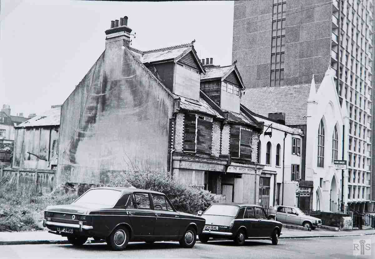 James Gray: Looking into the High Street at the derelict shops, Gordon Hall and the tall St James’s House flats. Photographed on June 10 1979, the four old buildings have now gone, and flats called Kebbell Lodge are being built on the cleared site. jgc_24_027