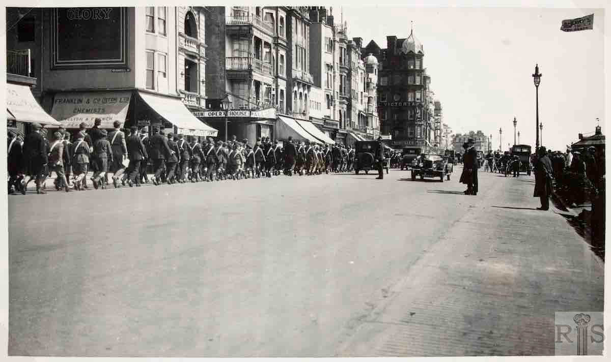 James Gray: Men of the Royal Garrison Artillery, escorted by civilians, marching from a Church Parade along Kings Road, between Russell Street and West Street, during 1908. jgc_02_193