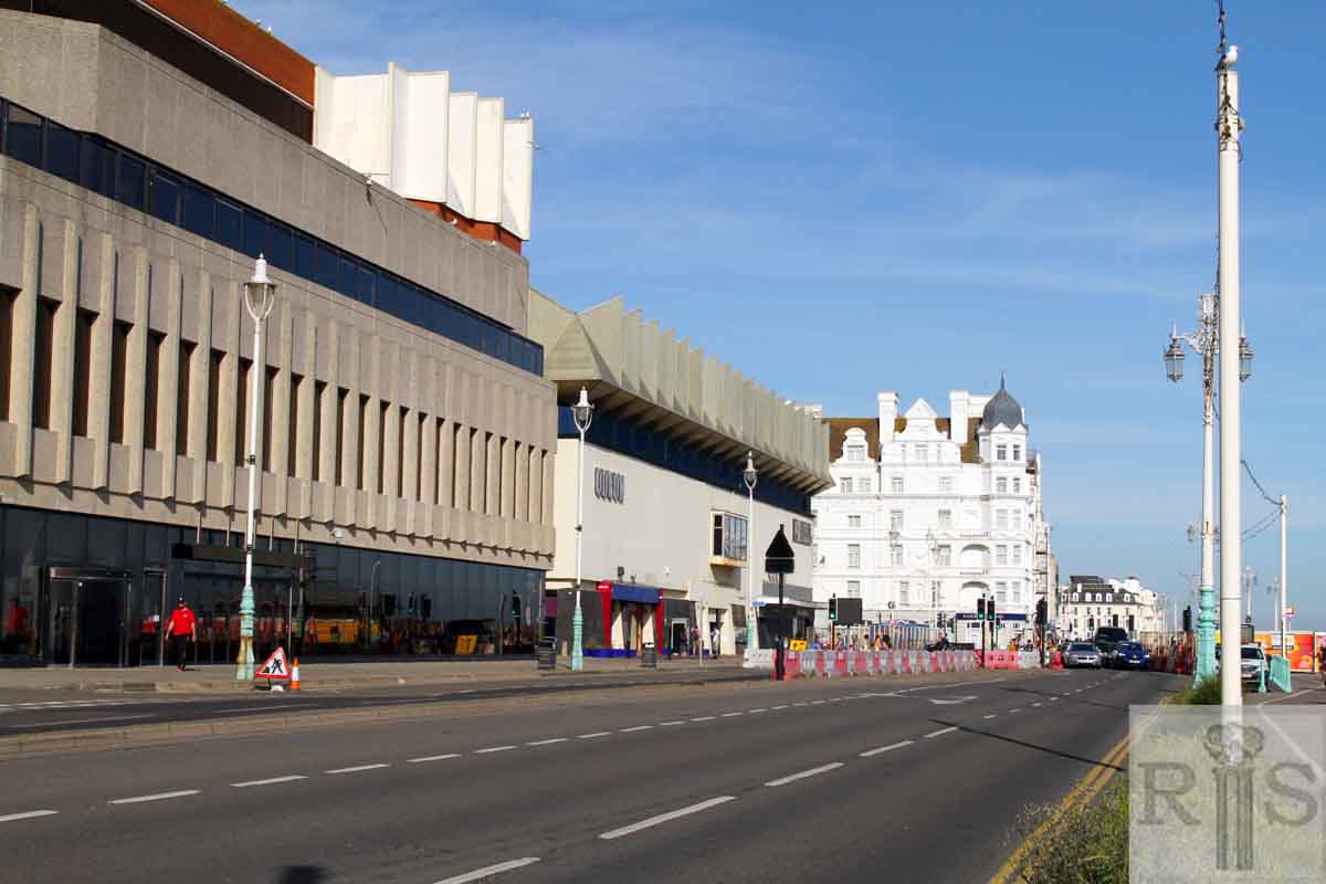 2020: The three James Gray pictures here show the area now occupied by the bulk of The Brighton Centre, as seen in the 2020 image. The Palladium Cinema closed in 1956 and was demolished in 1963 as were the buildings occupied by the Expresso Coffee Bar, the Astoria Cafe and many other small businesses. The Brighton Centre, a conference and exhibition space, was opened in 1977. (Photographer: David Sears)
