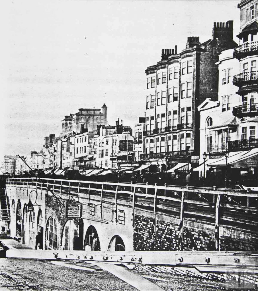 2020: The James Gray 1866 image shows the corner of Middle Street on the right, running north, and King’s Road, running diagonally left to right (west to east) in the forefront. Other images of this stretch of King’s Road can also be found on this page. The five-storey building at the corner of King’s Road and Middle Street in the 1866 image with its distinctive balustrade has been replaced by a larger eight-storey block offering one bed flats for rent to students at the University of Sussex. The doorway at 54-55 King’s Road shows its original title which was Kings Mansions. (Photographer: David Sears)