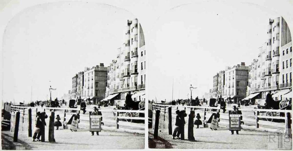 James Gray: A present day copy of an old stereoscopic photograph, which was one of a dozen taken on a sunny day in the Autumn of 1863. The surprising bend in the roadway and pavement makes it difficult to realise that the photographer was standing opposite Ship Street and that the road turning at the right is Middle Street. King’s Road and the promenade were straightened and built out in 1866. Note the sign on the lamppost directing people to the Post Office, then as now in Ship Street. jgc_03_129