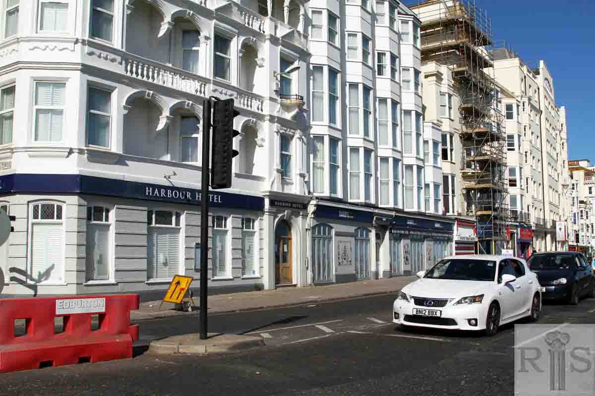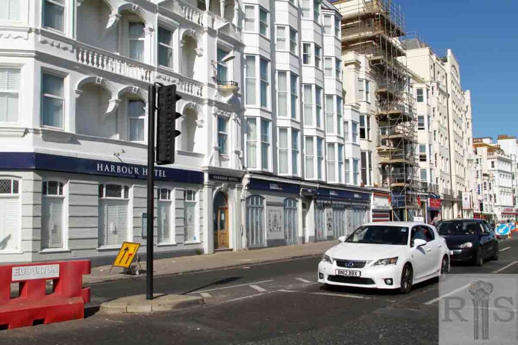 2020: This image looks east along the King’s Road from the corner of West Street; the previous image jgc_03_016 includes the same buildings looking west. The low white building at 58 King’s Road, formerly the photographic studio of William Constable, can be seen in the new image. Everything else on this corner was redeveloped in 1883, 17 years after the original image was taken, to form the impressive red-brick Orleans Residential Club. After trading under a number of different names, it reopened in 2016, now as the white-painted 4* Harbour Hotel. The road in front is currently undergoing repairs after a partial collapse into the arches below in 2013. (Photographer: David Sears)