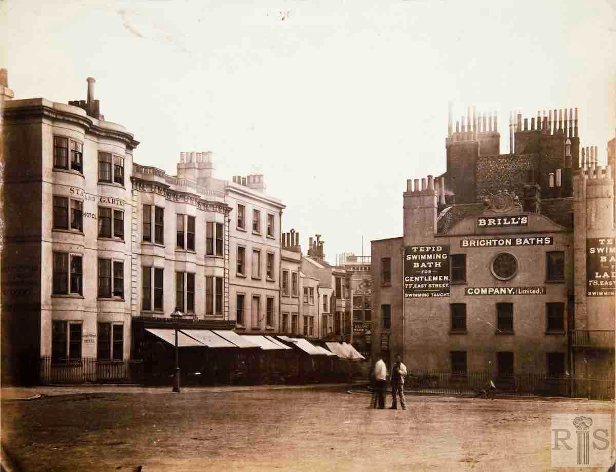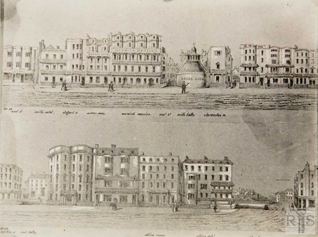 2020: On the left (east) of the James Gray pictures is Harrison’s Hotel, now replaced by Jurys Inn. Behind Harrison’s, and still there today, is the Star and Garter Hotel and its neighbours on the corner of Little East Street. To the right is Queens Hotel, built in 1846. Between them is the low building mentioned by James Gray – the bath house opened by Sake Deen Mahomed in 1821. The sign on the wall offers ‘shampooing’, a traditional Indian head massage technique Mahomed introduced to Britain. The baths had recently been acquired by Charles Brill at the time of the 1850s image. They were demolished in 1869 and Markwell’s Hotel, now part of Queens Hotel, was built in their place. (Photographer: David Sears)