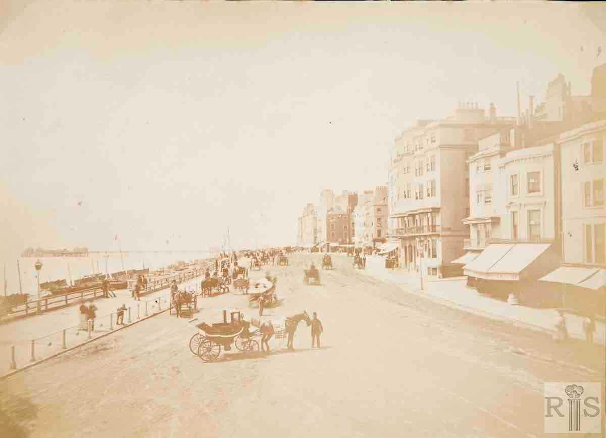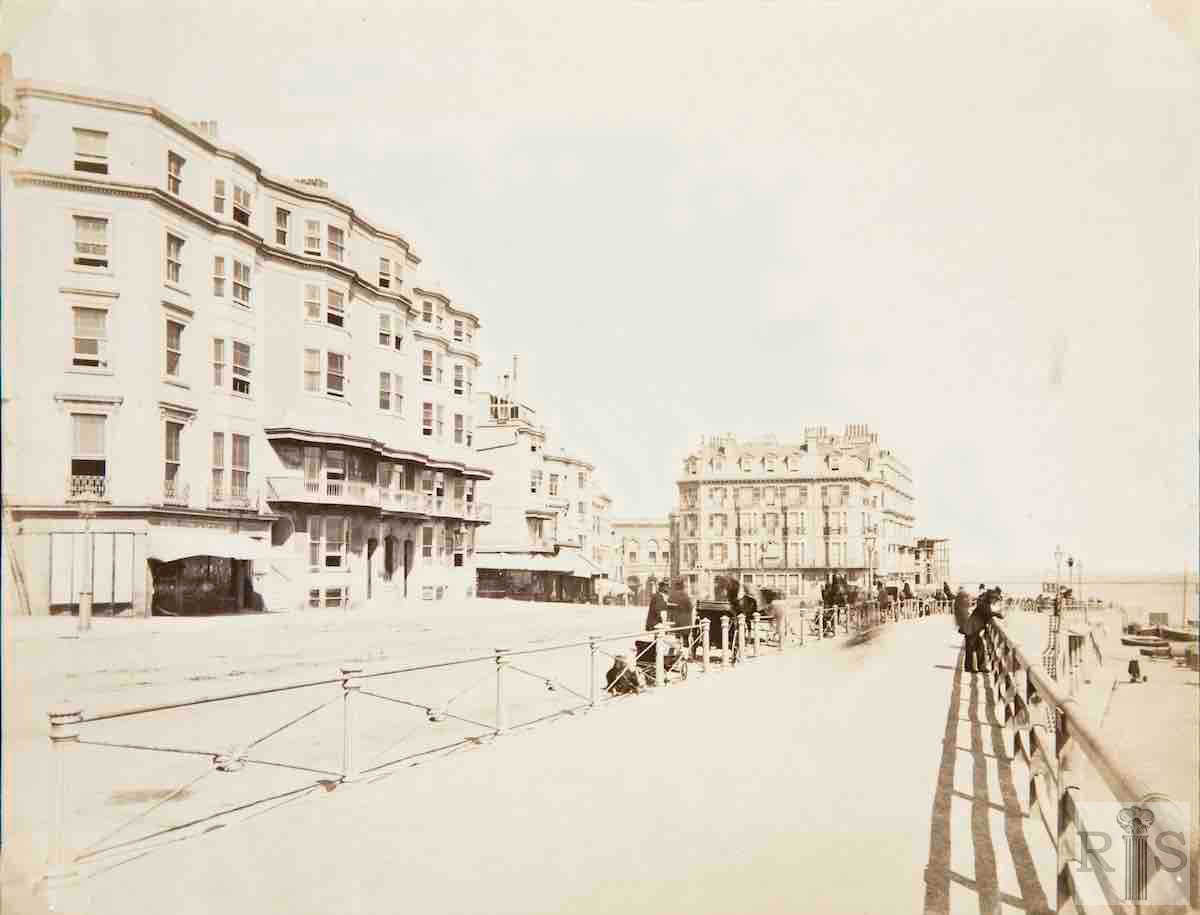 James Gray: Photograph of 1870, showing King’s Road almost devoid of traffic and of people. In the distance, the Chain Pier. The promenade was then quite narrow, being widened to its present width in 1886. At the far end of King’s Road can be seen Brill’s Baths, erected in 1869, while the building under construction was the Clarendon Hotel at the corner of East Street which replaced an old lodging house known as Clarendon Mansions. It is this building which dates the photographs because it is well known that it was built in 1870. jgc_03_190