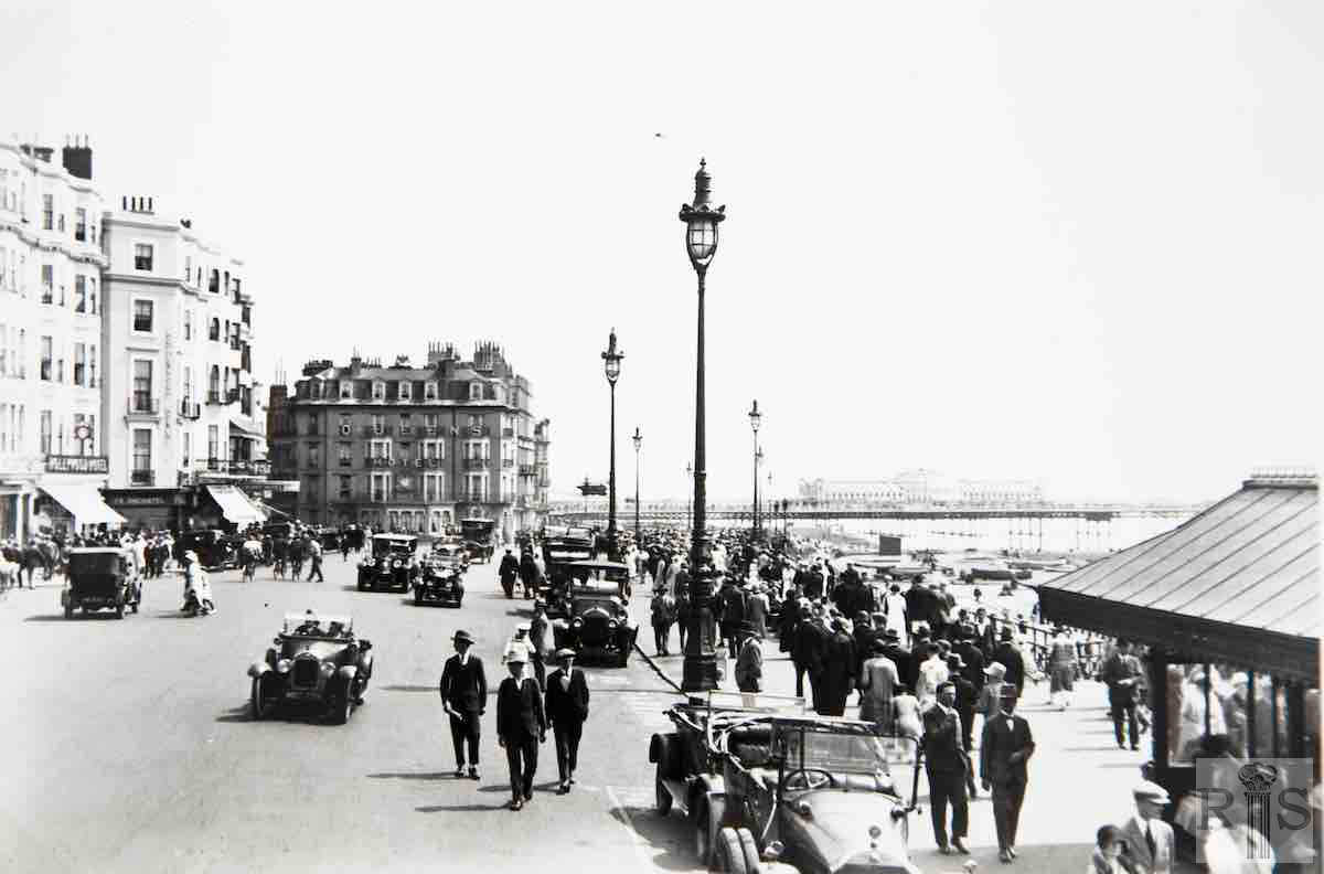 2020: Images jgc_03_073 and 203 [below], taken in 1923 and 1927 respectively, show two near identical views of King’s Road looking west from Ship Street. The ornamental lamps on the south side of King’s Road are still in place. The shops along the front between Ship Street and Middle Street have almost all turned into restaurants and fast food vendors. The large building on the corner of Middle Street was known originally as Kings Mansions. It currently offers budget accomodation for students. (Photographer: David Sears)