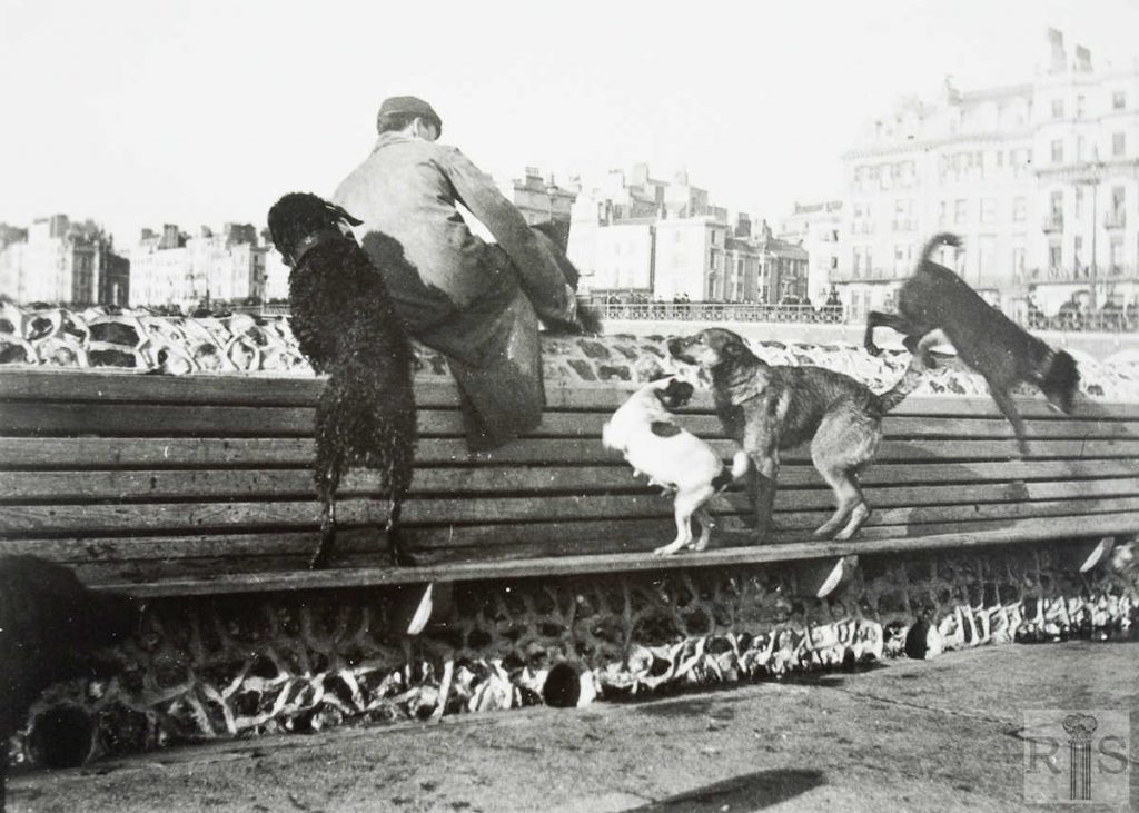 James Gray: Fun and games for a man and his four dogs on the East Street Groyne. The photographer is George Ruff, Junior, and the period between 1900 and 1904. Very little change can be discerned in the King’s Road buildings, now in 1984. jgc_04_012
