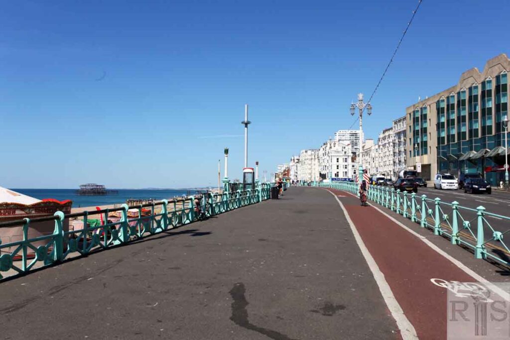 2020: The i360 tower is the most prominent landmark in 2020, with the much diminished remains of the West Pier in the background. A cycle lane runs along the promenade. (Photographer: David Sears)