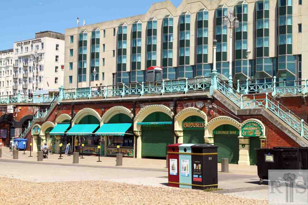 2020: The arches underneath the ramps in front of the Old Ship Hotel are occupied by the Brighton Fishing Museum and the Brighton Fisherman’s Society. On the beach in front are fishing boats and an original capstan, one of many that used to be seen on the beach. (Photographer: David Sears)