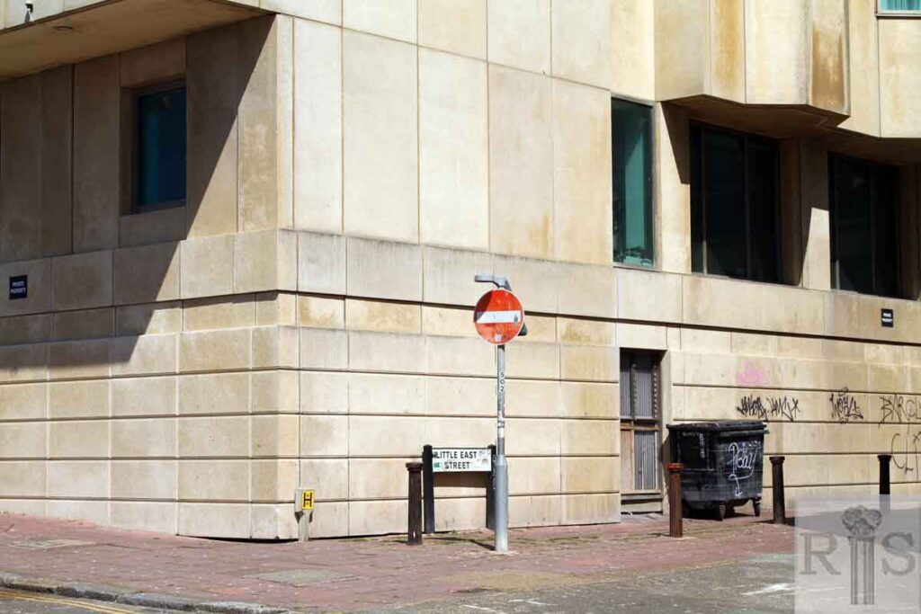 2020: The car park shown in the original image is now covered by the concrete block of the hotel currently trading as Jurys Inn Brighton Waterfront. The original buildings behind it still stand, tucked away in Little East Street, which was pedestrianised in 1987. The tall brick-faced building is now an Indian restaurant, the building to its right (south) is 18th century and currently a tattoo studio. To its right is a bar and restaurant called The Pipeline. (Photographer: David Sears)