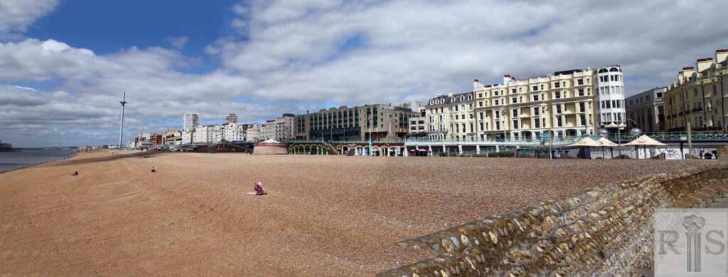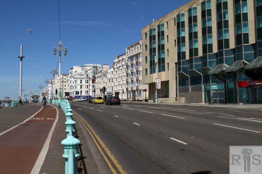 2020: These pictures show the hotels along King’s Road between Middle Street and East Street. In 2020 the flagpoles have been replaced by streetlights; there are black waste bins and blue recycling bins everywhere and the boats on the beach are exhibits outside Brighton Fishing Museum. (Photographer: David Sears)