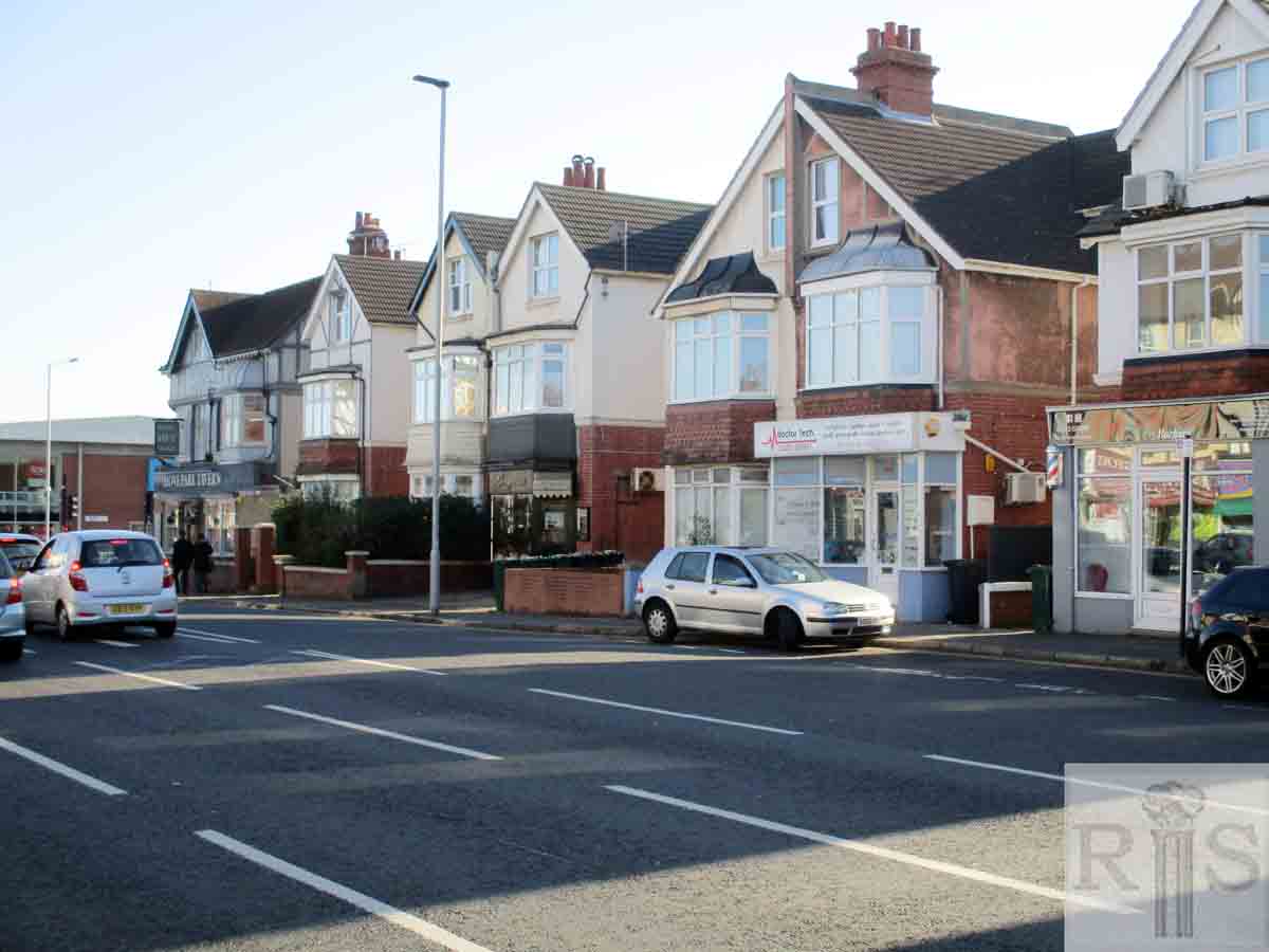 James Gray: The south side of Old Shoreham Road was little affected by the widening except for a contraction of the pavement for a bus bay. The purpose of this photograph is to show the changing character of the buildings between Sackville Road and Leighton Road all built early in this century as private dwellings with small front gardens.